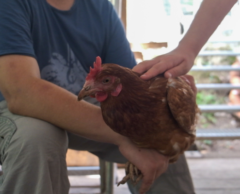 Sonne, Wind und Regen härten die Hühner ab. Sie finden Gras und Kleintiere. Das angebotene Sandbad dient der Gefiederpflege. Der dichte Zaun und die Netze schützen vor Fuchs, Marder, Habicht und Bussard.
